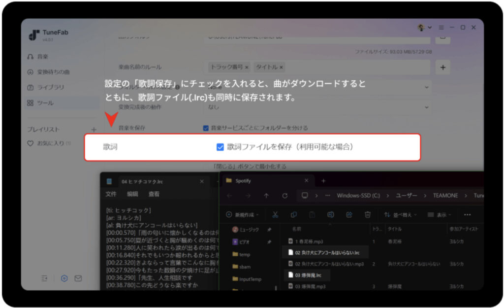 今回から、変換と同時にタイムタグ付きの歌詞データのダウンロードにも対応しました。変換が完了した楽曲に対して、対応サービスの歌詞情報を自動で取得し、プレイヤーや対応アプリで歌詞を表示できるファイルも同時に保存されます。