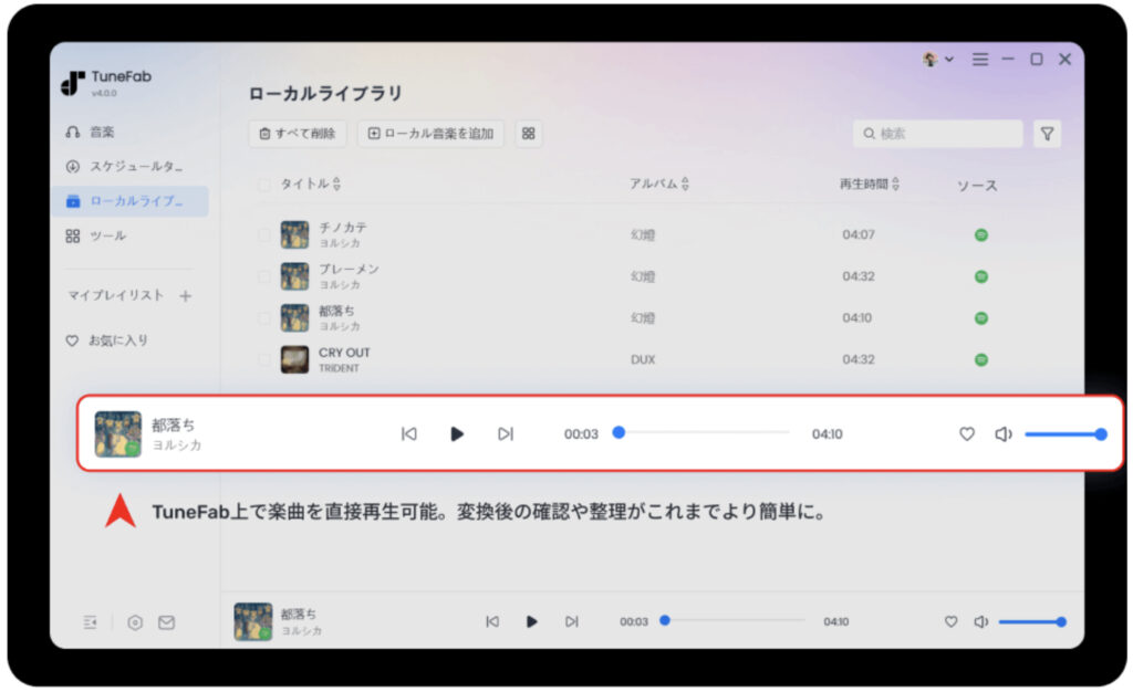 TuneFabで変換・ダウンロードした音楽やオーディオブックは、自動的に「ライブラリ」に登録され、すぐに再生できます。たとえば、Spotifyから保存した曲をネット環境のない場所で聴きたいときも、ライブラリからクリックするだけでオフライン再生が可能です。操作は直感的で、迷うことはありません。