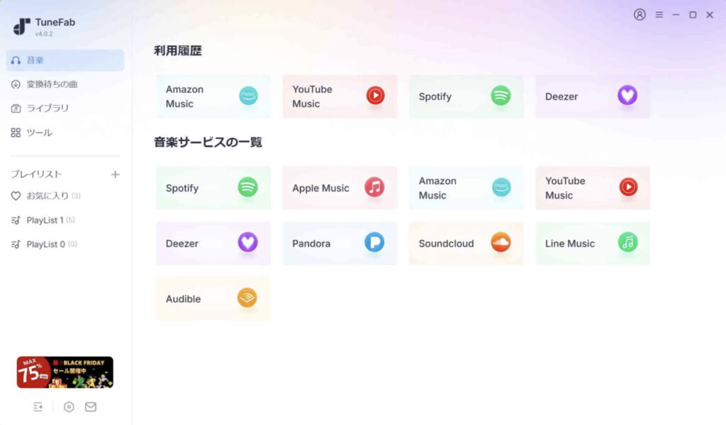 TuneFab音楽変換は、Amazon MusicやSpotifyなど多様な配信音楽から楽曲をダウンロードする人気ツールです。保存したファイルはそのままオフライン再生ができます。有料会員の継続費用や通信料の節約になるので、多くのユーザーに親しまれています。